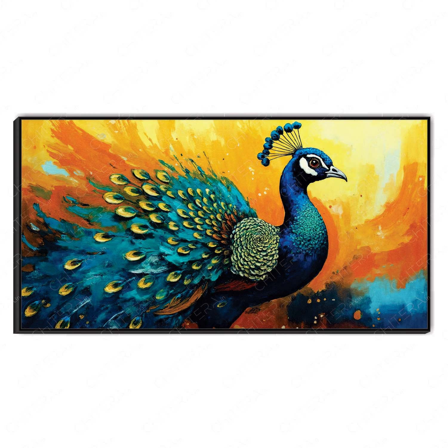 Peacock Glory in Radiant Sunset Tones Canvas Wall Art features vibrant colors and fine details on premium canvas, adding a striking and elegant focal point to your living space.